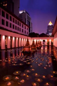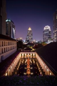 Ein kulinarischer Höhepunkt des Hauses ist das mehrfach ausgezeichnete italienische Restaurant „La Scala“. Als ursprünglicher Designer des Hotels bewahrte Edward Tuttle die Essenz der Sukhothai-Ära des 13. Jahrhunderts. Die Vorliebe des Designers für klare, einfache Linien und die Verwendung verschiedenster Materialien stehen für kulturelle Sensibilität und Originalität. So sind die Club Wing Zimmer und Suiten mit Teakholz, Granit, Keramik und Seide ausgestattet. Traditioneller Salon-Stil vergangener Zeiten wird hier mit modernster Technologie und Komfort verbunden. Das Haus bietet zahlreiche weitere Annehmlichkeiten. Der Pool erinnert mit seinen Mosaikfliesen an die Ruhe und Symmetrie thailändischer Palastarchitektur. Für die Privatsphäre stehen voll ausgestattete Cabanas zur Verfügung, auch das moderne Fitnessstudio läßt keine Wünsche offen.
